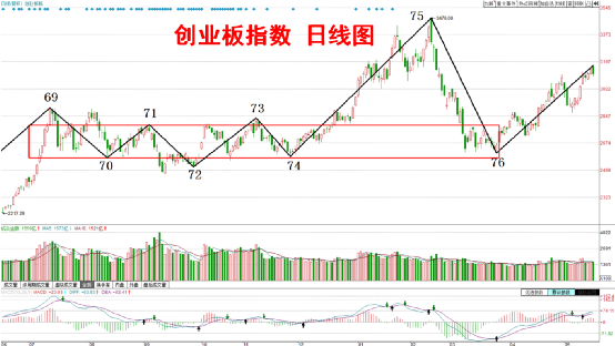 创业板指数: 创业板本周走的比上证指数强,从结构看已经来到了今年1-2月份的前高压力区域,所以警惕这里有震荡的可能性。如果下周走势能做出横盘震荡的话,那在调整之后大概率还会创新高的表现。如果下周走势出现回落,首先观察回落的幅度,本周一的跳空缺口,就是一个非常好的观察点,如果被回补的话,指数就有走弱的可能性。