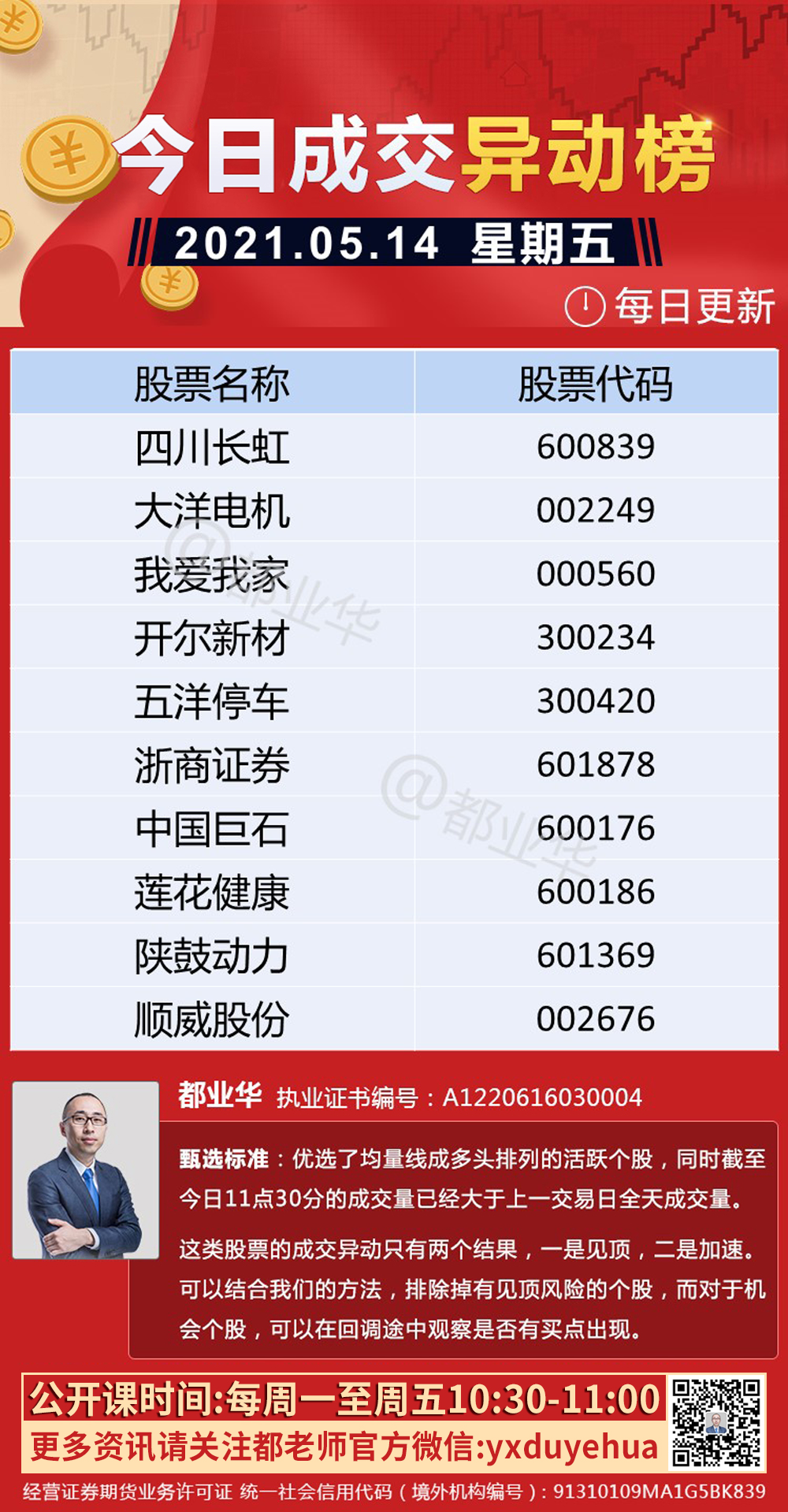优选了均量线成多头排列的活跃个股,且成交量大于上一交易日的全天成交量。
