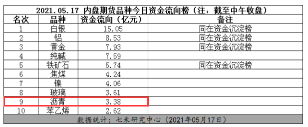 今日(5月17日)国内商品期货收盘走势分化,沥青主力合约涨停,收盘,报3254元/吨,上涨240元,涨幅为7.96%,该合约成交量为736479手,持仓量为194363手。