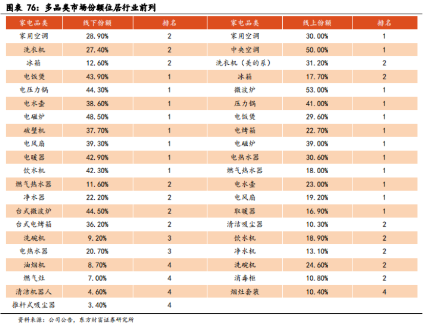 分渠道来看,公司在线上渠道的表现相对于线下更好;分品类来看,电饭煲、压力锅、电水壶、电磁炉、电风扇、电暖器线下线上市场份额占比均为首位。