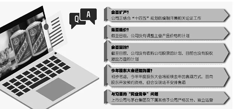 - 5月19日下午,贵州茅台董事长高卫东携主要高管参加贵州茅台2020年度及2021年第一季度业绩说明会,与投资者进行了线上交流, 对扩产、提价回购等焦点问题逐一进行了回应。