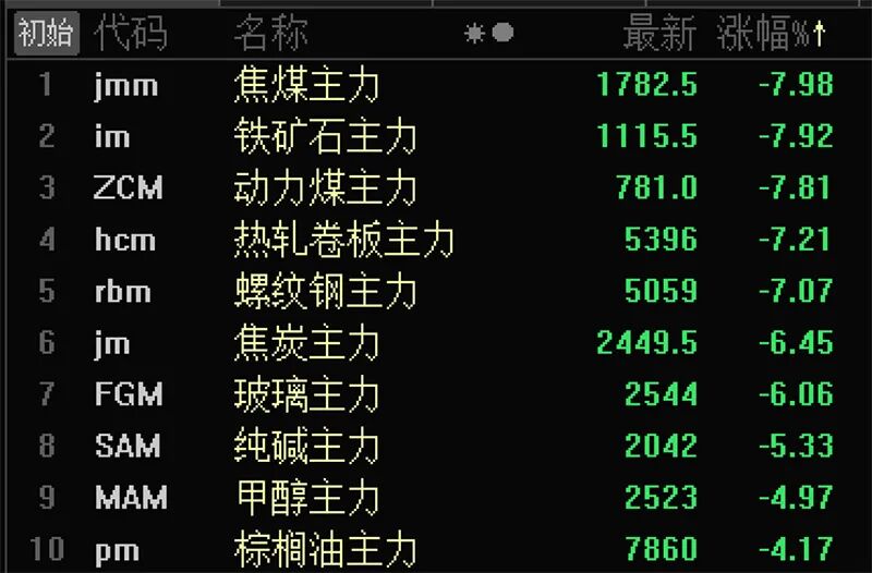- 国内期市5月19日夜盘出现跳水行情,黑色系、化工品、农产品等期货品种集体下跌。 截至当天夜盘收盘,焦煤跌7.98%,铁矿石跌7.92%,动力煤跌7.81%,热轧卷板跌7.21%,螺纹钢跌7.07%,焦炭跌6.45%,玻璃跌6.06%,纯碱跌5.33%,甲醇跌4.97%,棕榈油跌4.17%,豆油跌3.89%。