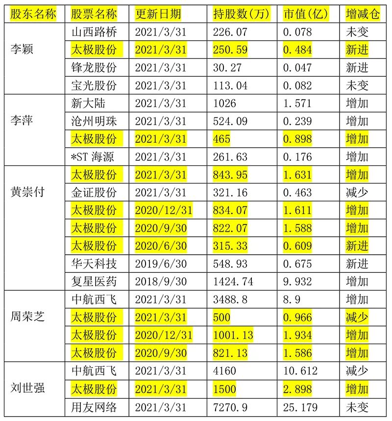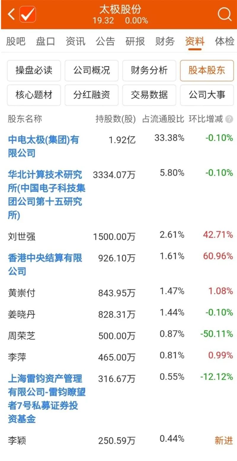 从刘世强持有太极股份情况看,从去年一季度以来,他连续四个季度加仓太极股份。具体加仓变动如下: