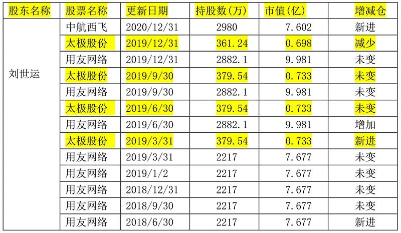 需要指出的是,早在2019年一季度,一个名叫刘世运的自然人进入太极股份前十大流通股东名单,截至2019年一季度末,持有380万股,并且一直持有到2019年底,在2019年四季度仅减持了18万股。通过上市公司股东名单可以发现, 刘世运也持有过用友网络、太极股份和中航西飞,此人基本可以确定是刘世强兄弟。