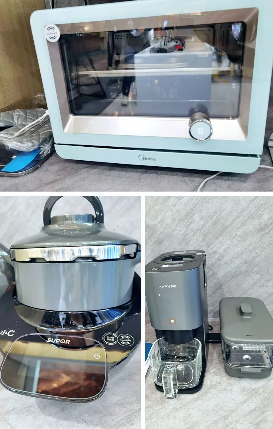 在智能厨房展区,记者看到了美的蒸烤料理炉、苏泊尔智能电饭煲、九阳豆浆机等多种小家电。