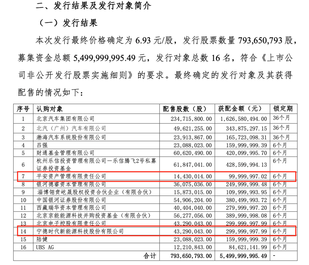 根据公告,此次发行对象最终确定为16家,所有发行对象均以现金方式认购此次非公开发行的股票。其中,宁德时代获配3亿元,平安资产管理有限责任公司获配1亿元,UBS AG获配近8500万元。