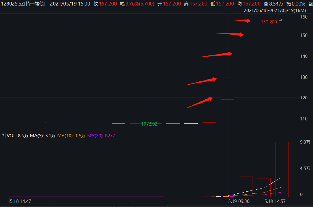 尾盘三分钟复牌后继续大涨。仅用5笔交易,特一转债单日便成功大涨45%。