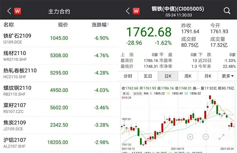随着政策调控大宗商品价格的力度层层加码,5月24日早盘,国内工业品期货进一步下跌。截至午间收盘,黑色系领跌,铁矿石跌近7%,热轧卷板、螺纹钢跌逾4%,焦炭跌逾3%。工业金属全线下跌,沪铝跌近3%,沪镍跌逾2%。