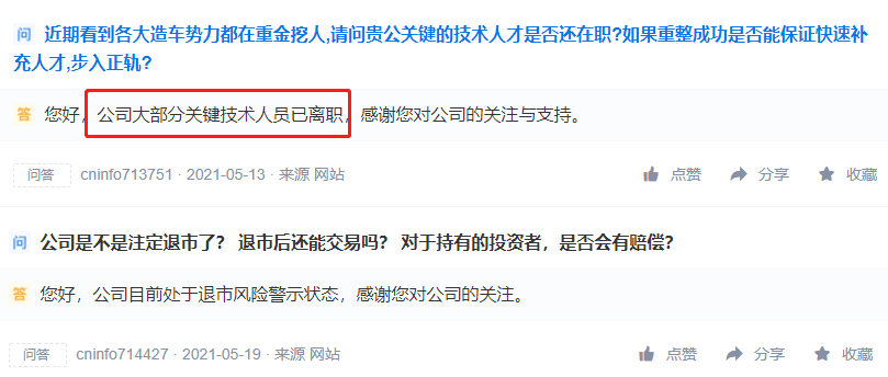 互动易上的董秘回复也反映了*ST众泰当前经营状况的惨淡:大部分关键技术人员已离职,股票处于退市风险警示状态。