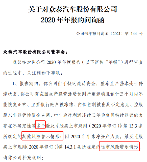 5月19日,*ST众泰收到年报问询函。问询函共有14个问题,公司被要求说明采用持续经营假设为基础编制2020年年报的依据是否充分;营收大幅减少的前提下,销售商品、提供劳务收到的现金较往年增长的具体原因等。