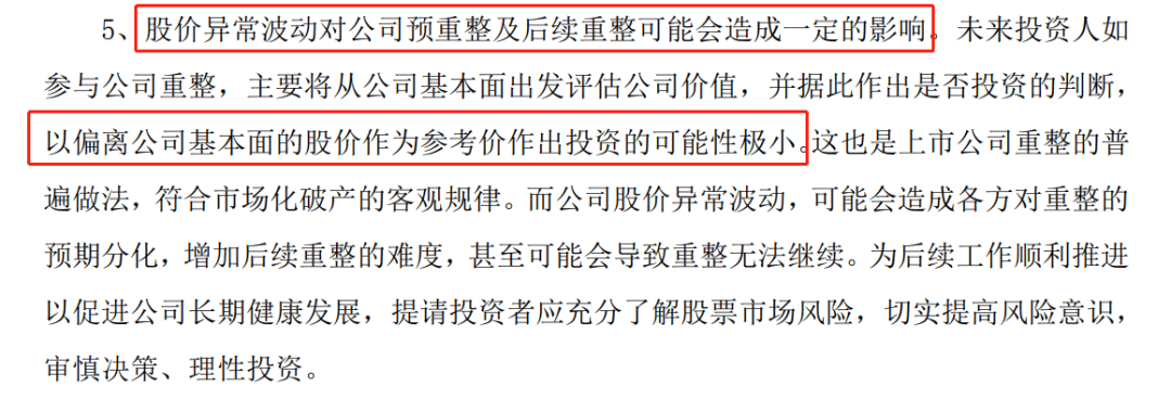 特别值得标红的一段是:“公司股价异常波动,可能会造成各方对重整的预期分化,增加后续重整的难度,甚至可能会导致重整无法继续。”