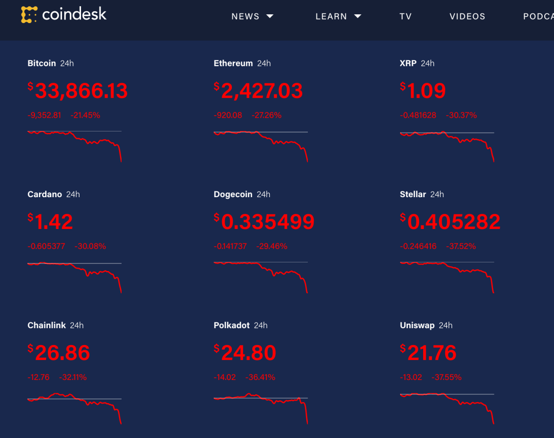 比特币于今日午间跌破4万美元/枚,较历史高点回落约25000美元,截至发稿,一度跌破33000美元关口,日内跌超26%;以太坊日内大跌超40%;狗狗币日内跌幅更是超过40%。