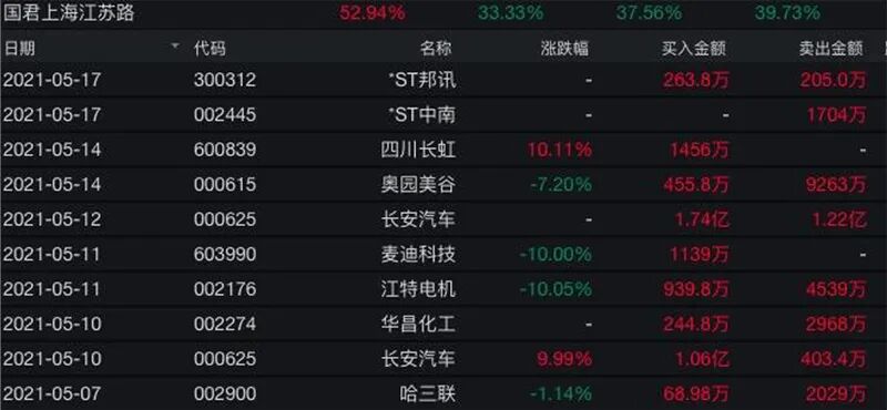 国泰君安上海江苏路营业部也是老牌的游资席位之一,近一个月26次登上龙虎榜。翻看该席位5月以来的上榜记录,标的集中在汽车、碳中和概念股,短线交易操作的特征明显。