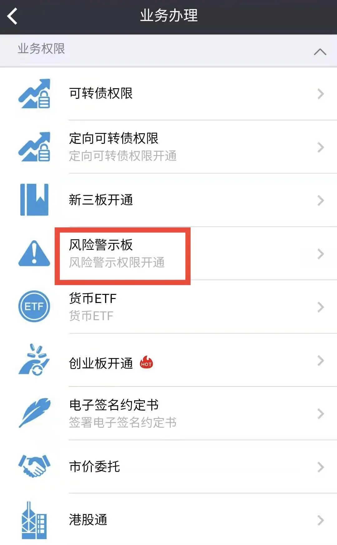 在“融e通”APP首页-点击【业务办理】-选择【风险警示板】
