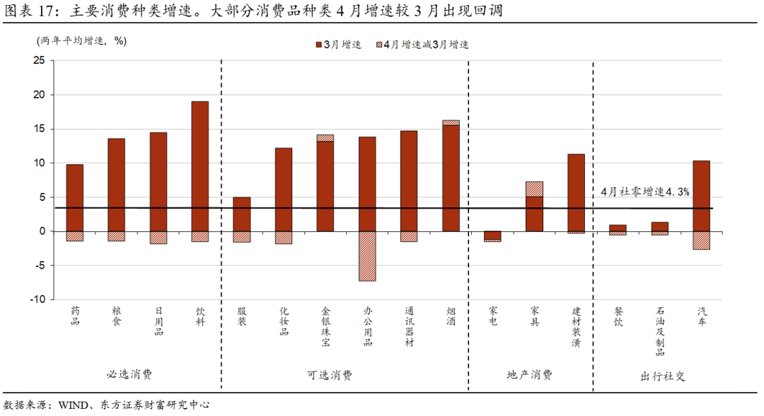 餐饮和商品零售同步回落,餐饮服务增速再次回调至零附近。 分具体类别看,4月可选消费、必选消费、地产消费、出行类消费增速较3月份均有普遍下跌,仅金银珠宝、家具、烟酒增速较3月增速上升。