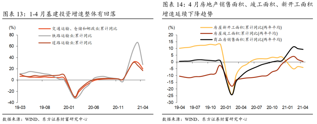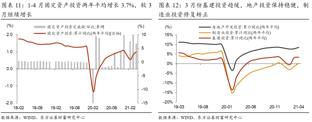 3.投资:地产、制造业投资带动修复 投资整体保持修复趋势。 1-4月固定资产投资累计同比19.9%,两年平均增长3.7%,较前月增长一个百分点。4月固定资产投资环比增1.5%,较上月的2.1%有下降,但仍然大幅高于19年环比水平。 4月投资增速主要由房地产和制造业投资拉动,基建投资增长较为缓慢。 1-4月份基建投资平缓(两年平均增2.2%,与前值基本持平),地产投资保持稳健(两年平均增8.4%,较前值7.7%提高),制造业投资修复转正(两年平均增0.3%,是修复速度最快的领域)。三个领域的投资表现基本均未超出预期,未来需要关注两项:一是房地产开工销售数据显示地产投资或将放缓;二是制造业投资的修复程度。从制造业投资拉动力看,疫情预期趋稳,生产增加值改善;从阻力看,上游大宗商品价格存在挤压盈利趋势。结合来看,投资拉力是高于阻力的。