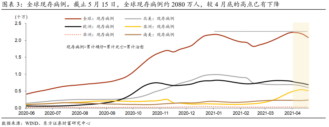 1.全球疫情:印度疫情达峰回落,经济对疫情冲击“免疫” 印度疫情出现转折,爆发式激增或暂告一段落。 5月5日,印度单日新增病例达到峰值39万人,此后开始逐步下降,带动全球疫情阶段性缓解。本次第三轮海外疫情自3月份出现,到4月末5月初达到峰值。主要特征是增长曲线陡峭,且主要集中于印度,考虑到新变异病毒传播力较强,后续是否再次反复仍不明朗。