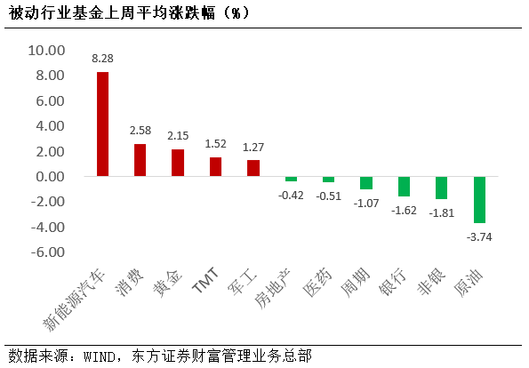 被动行业 指数方面,上周新能源汽车 行业ETF一枝独秀 ,大幅上涨8.28%,消费行业ETF和黄金行业ETF涨幅紧随其后,涨幅均在2%以上, 而周期行业和原油行业ETF在上周调整较多主要是国常会发言所导致的大宗商品有价格下跌的预期所产生的下跌。 外围不确定性因素导致市场主线尚未清晰,板块轮动较快。