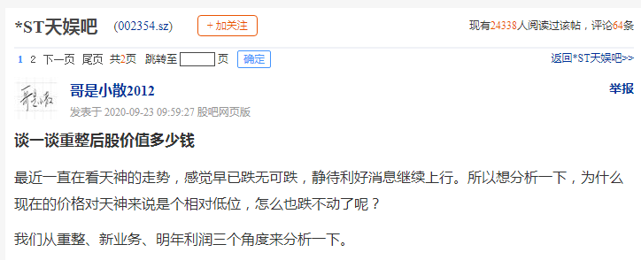 而因此前连爆多雷,许多散户也没想到天神娱乐能够这么快实现大逆袭!在股吧里,有网友甚至讨论起了重整之后的天神娱乐到底值多少钱。