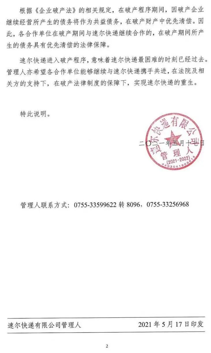 5月18日,速尔快递发布官方声明宣告破产重组,并强调,经管理人初步调查,速尔快递仍具备较高的重整价值,应立足于通过破产程序使速尔快递摆脱困境。进入破产程序将有助于公司摆脱历史负担,聚焦精力于主营业务的持续和发展。