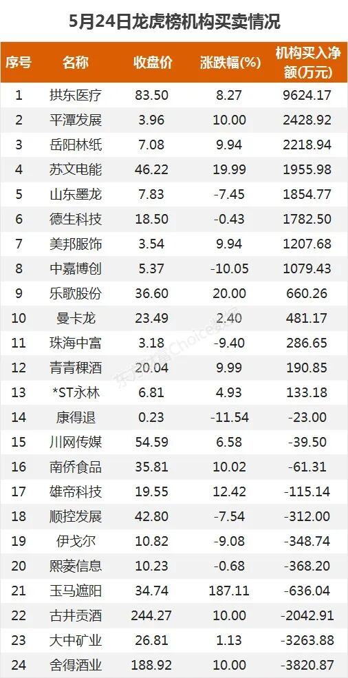 机构参与龙虎榜中个股共涉及24股,其中13股被机构净买入,拱东医疗被买入最多,为9624.17万元。另外11股被机构净卖出,舍得酒业被卖出最多,为3820.87万元。