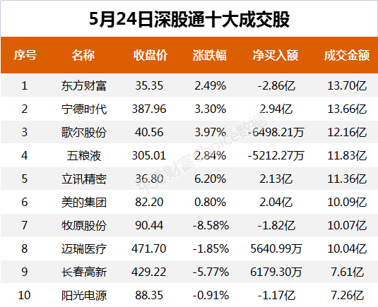 5月24日,北向资金当日成交净买额为18.86亿元。其中,沪股通当日成交净买额为5.72亿元;深股通当日成交净买额为13.14亿元。