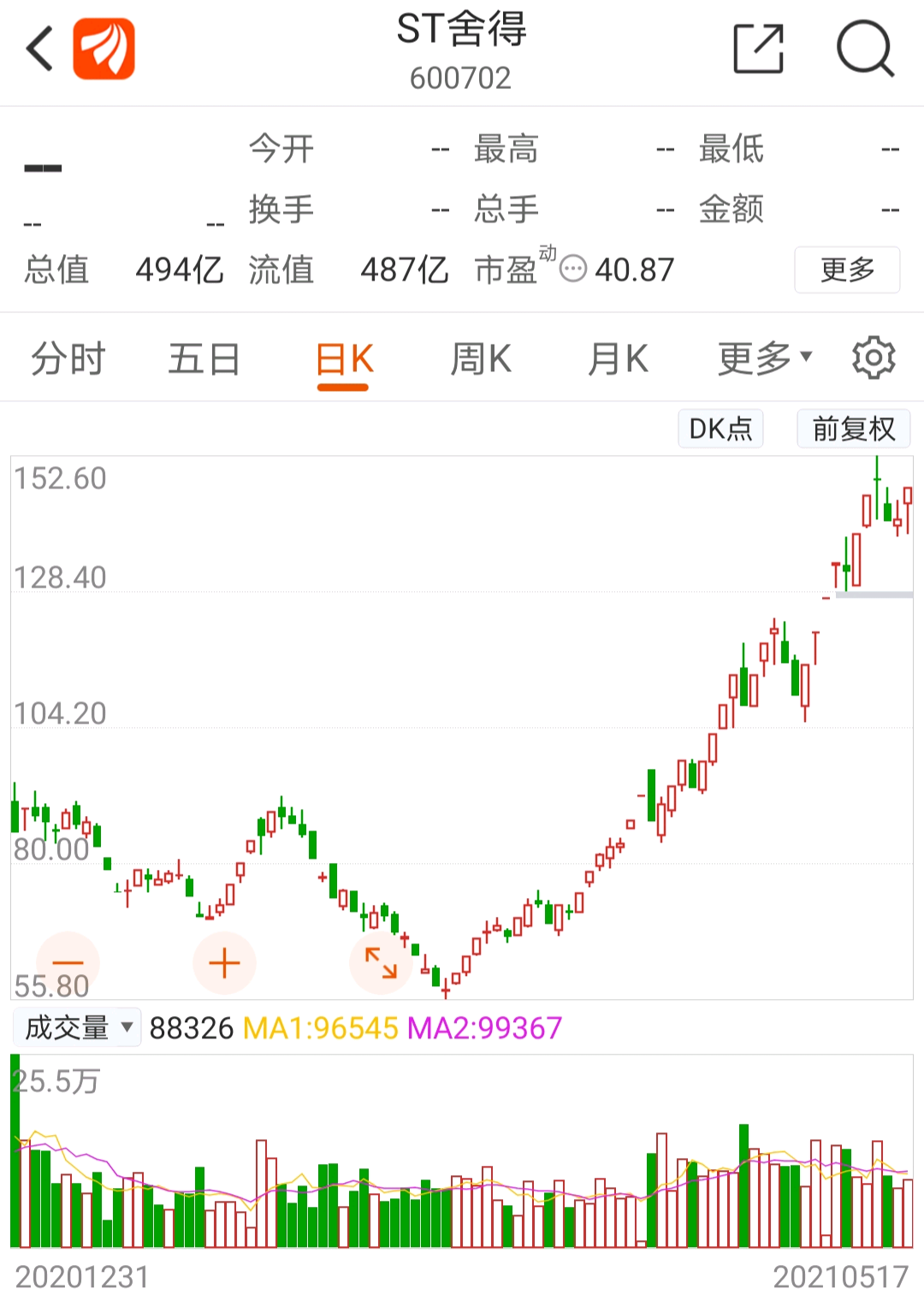在暴涨150%多后,“史上最牛ST股”ST舍得要摘帽了!从3月9日至今的46个交易日里,ST舍得录得20个涨停板,累计上涨153%,也成为A股历史上第一只百元ST股。期间总市值也从初始的193亿,飙升至如今近500亿。