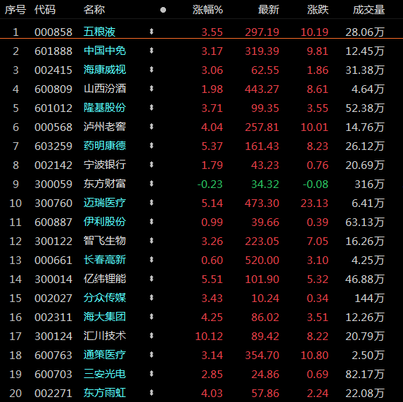 核心资产这边茅台、五粮液、迈瑞医疗、中国中免、海康威视药明康德等均录得不俗的涨幅,汇川技术甚至涨停。
