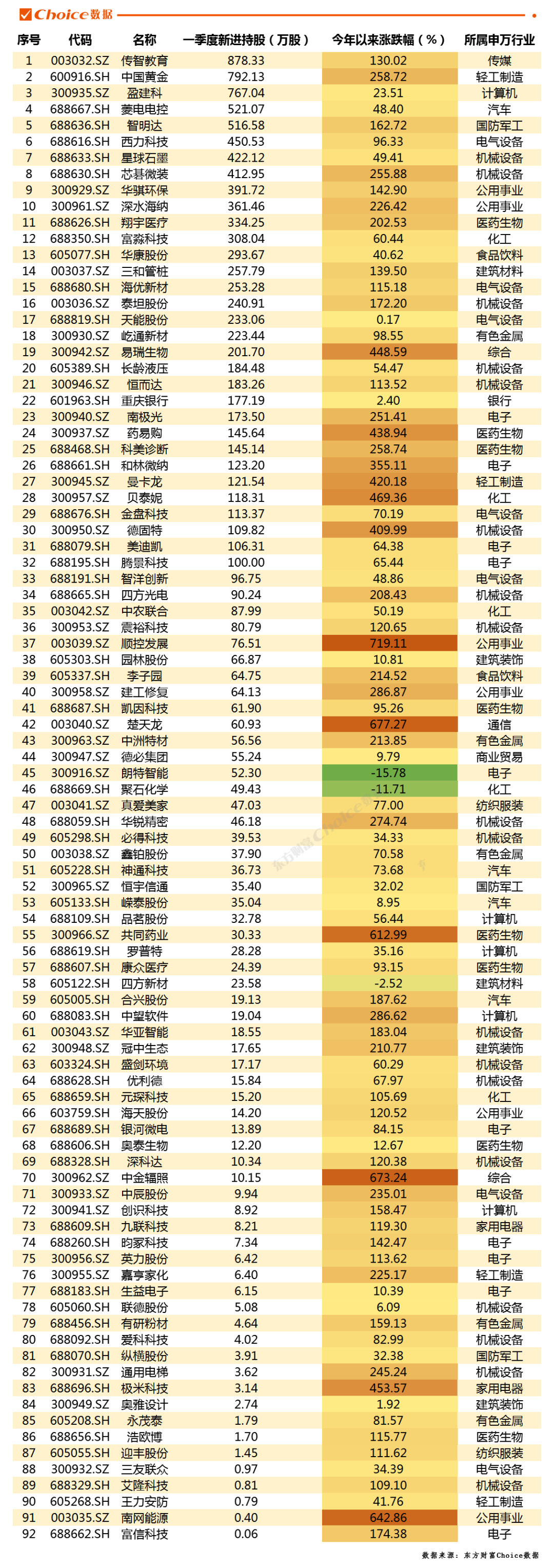 从新进持股量最高的个股来看,涨幅也能实现翻倍走势。 传智教育 机构一季度新进持股量最多,为878.33万股,其今年以来的涨幅达130.02%, 中国黄金 机构新进792.13万股,今年以来涨幅达258.72%。