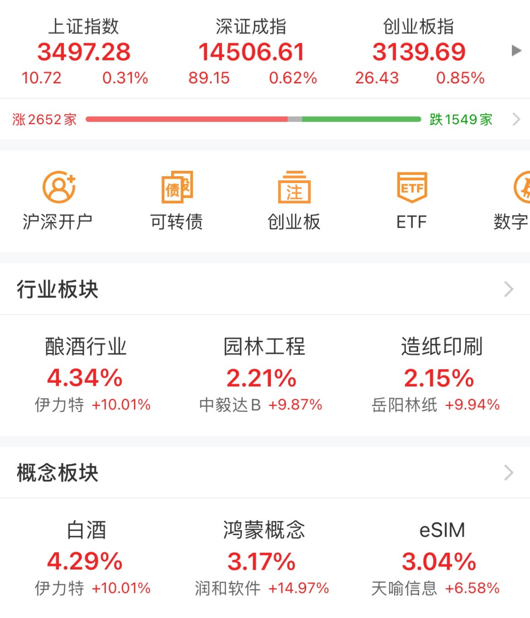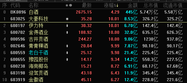 白酒今日领涨所有板块,大豪科技(红星股份)、伊力特、舍得酒业、古井贡酒、青青稞酒、老白干酒等个股涨停。