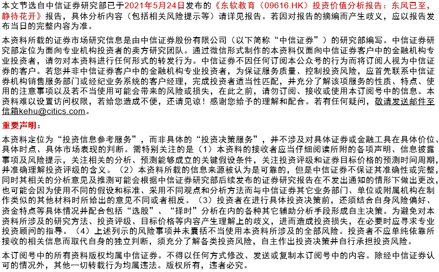东软教育是中国民办IT高等教育的领军者,IT专业数量/学生数在业内分别排名第一/第二。公司依托独特的IT产业背景和优质的办学水平,在高教政策催化以及资本助力扩张下,业绩增长确定性强。我们预计公司2021-23年调整后净利润为2.79/3.59/4.52亿元,对应EPS预测为0.42/0.54/0.68元,现价对应PE 12/9/7倍,结合行业平均估值,给予公司目标价9港元(对应2022年15倍PE),首次覆盖给予“买入”评级。