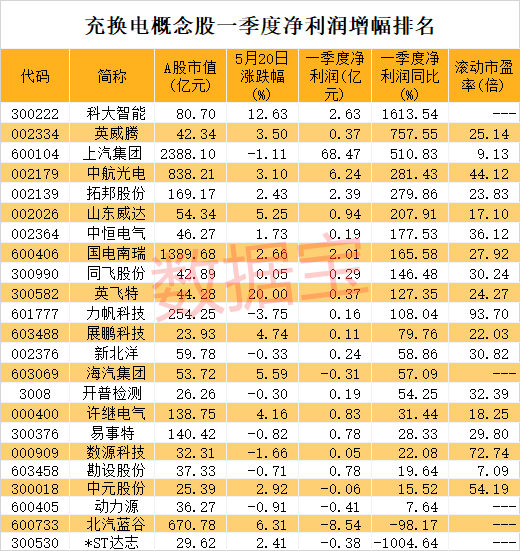 今年一季度有近一半的充换电概念股净利润翻倍增长,包括 科大智能、英威腾、上汽集团、中航光电、拓邦股份、山东威达 等。整车生产龙头上汽集团实现净利润68.47亿元,同比增长510.83%,5月以来北上资金增持该股939.5万股。不少机构继续看好公司2021年业绩,数据显示,机构一致预测上汽集团今年净利润为263.5亿元,同比增长28.97%。机构一致看好的充换电概念股还有 中航光电、国电南瑞、拓邦股份 。
