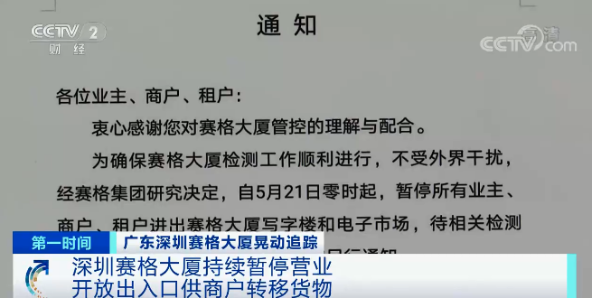 昨天早上,记者从赛格大厦商户处,获取的一份落款为深圳赛格集团有限公司的通知显示,为确保赛格大厦检测工作顺利进行,不受外界干扰,经赛格集团研究决定,自5月21日零时起,暂停所有业主、商户、租户进出赛格大厦写字楼和电子市场,待相关检测工作完成后再有序开放,有关事宜另行通知。