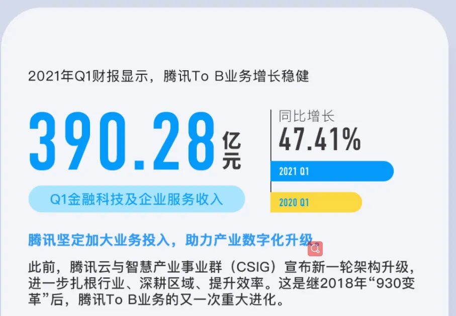 在腾讯各业务板块中,包括腾讯云在内的“金融科技及企业服务”单季收入390亿元,同比增长47%,增速明显高于整体增速。