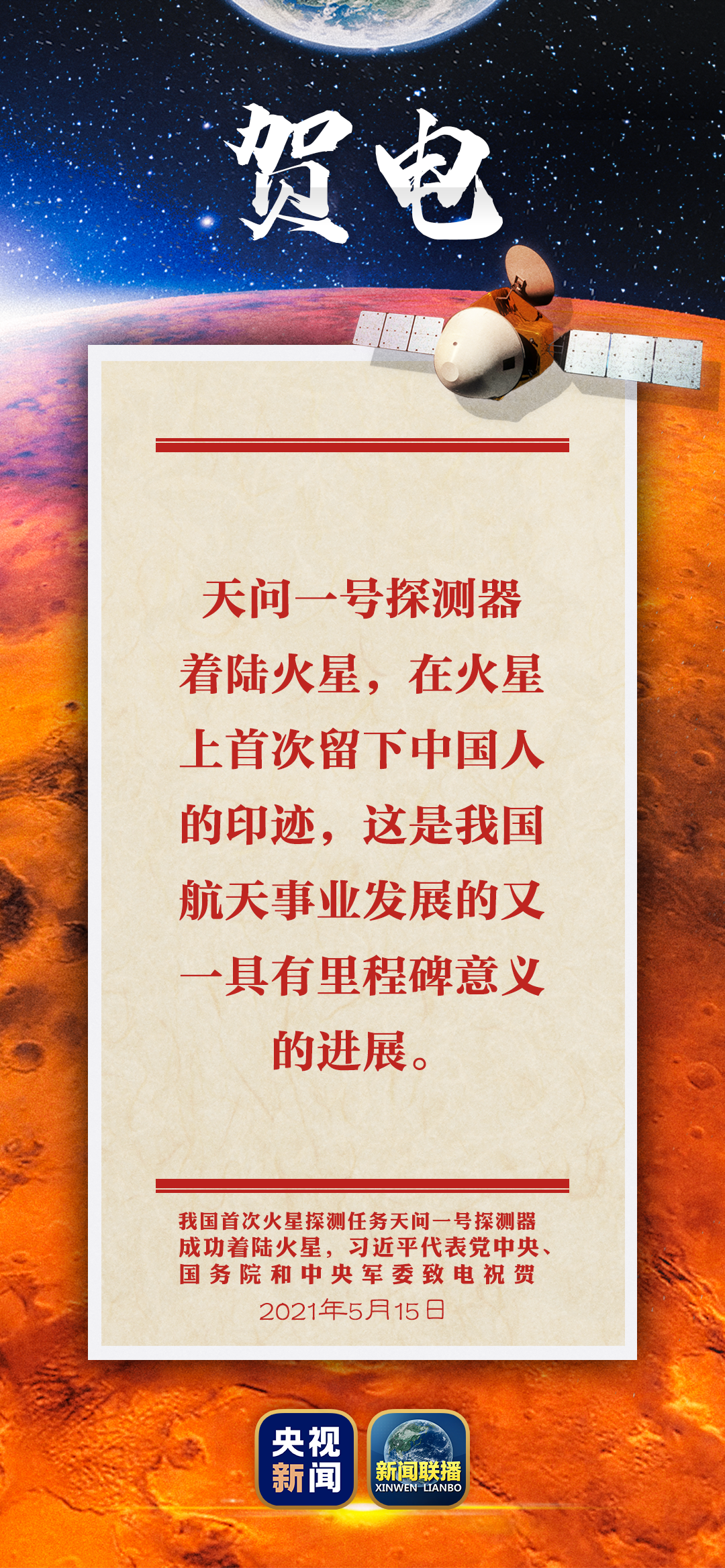 5月15日7时18分,天问一号探测器成功着陆于火星乌托邦平原南部预选着陆区,我国首次火星探测任务着陆火星取得成功。中共中央总书记、国家主席、中央军委主席习近平致贺电,代表党中央、国务院和中央军委,向首次火星探测任务指挥部并参加任务的全体同志致以热烈的祝贺和诚挚的问候。习近平在贺电中指出, 天问一号探测器着陆火星,迈出了我国星际探测征程的重要一步,实现了从地月系到行星际的跨越,在火星上首次留下中国人的印迹,这是我国航天事业发展的又一具有里程碑意义的进展。 你们勇于挑战、追求卓越,使我国在行星探测领域进入世界先进行列,祖国和人民将永远铭记你们的卓越功勋!习近平强调,希望你们再接再厉,精心组织实施好火星巡视科学探测,坚持科技自立自强,精心推进行星探测等航天重大工程,加快建设航天强国,为探索宇宙奥秘、促进人类和平与发展的崇高事业作出新的更大贡献!中共中央政治局常委、国务院副总理韩正在北京航天飞行控制中心观看天问一号探测器实施火星着陆情况。中共中央政治局委员、国务院副总理刘鹤在现场宣读了习近平的贺电。我国首次火星探测任务于2016年立项,计划通过一次任务实现火星环绕、着陆和巡视探测。天问一号探测器于2020年7月23日在海南文昌由长征五号运载火箭成功发射,2021年2月10日成功实施火星捕获,成为我国第一颗人造火星卫星,2月24日探测器进入火星停泊轨道,开展了为期约3个月的环绕探测,为顺利着陆火星奠定了基础。天问一号探测器成功着陆火星,是我国首次实现地外行星着陆,使我国成为第二个成功着陆火星的国家。中国国家航天局与欧空局、阿根廷、法国、奥地利等国际航天组织和国家航天机构开展了有关项目合作,将共同为探索宇宙奥秘、增进对火星演化的认知、了解生命起源等贡献智慧和力量。 习近平代表党中央、国务院和中央军委祝贺我国首次火星探测任务天问一号探测器成功着陆火星的贺电