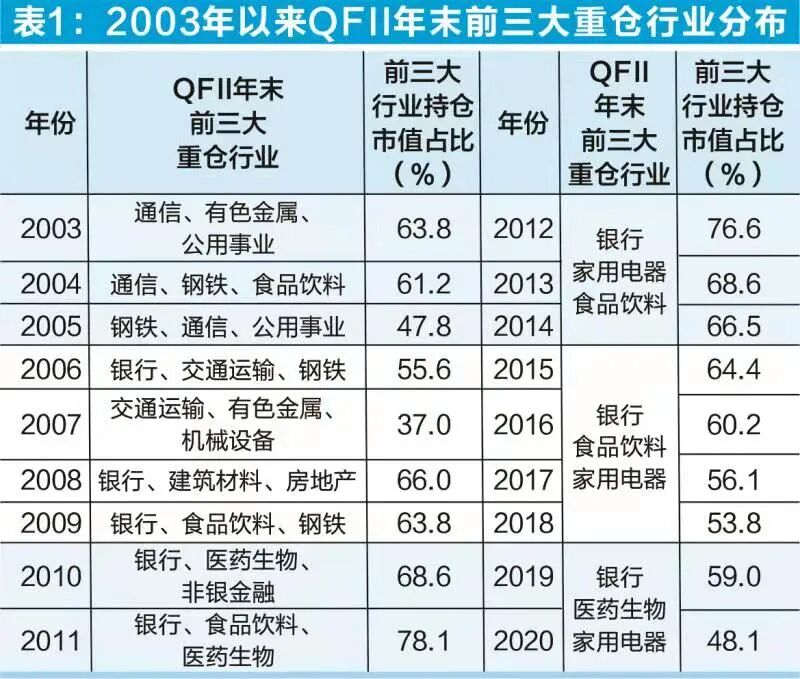 三是QFII对风险的规避意识较强,重仓行业主要集中于相对安全、受宏观调控影响较弱的本国传统优势行业。2011年以来,QFII前三大重仓行业主要分布在银行、食品饮料、家用电器、医药生物等四个行业,前三大行业持仓市值占比的均值超六成,这些行业受宏观经济周期的影响较小,具备低市盈率、高股息率的特征,体现QFII秉承价值投资和长期投资的理念。值得一提的是,2006年至2020年,15年中仅2007年末银行不是QFII第一大重仓行业。Wind数据显示,2007年随着股指的持续大涨,QFII开始逐步降低银行重仓股市值,2007年3月末银行重仓股市值由2006年末的76.2亿元降至64亿元,6月末下降至21.9亿元,9月末降至16.3亿元,12月末重仓股市值为零元。这说明QFII在股指高位以控制风险为主。