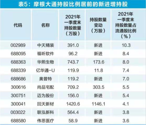 新进个股中,超五成个股集中于化工、机械设备、计算机和医药生物等4个行业,持股数量占流通股比例超1.5%的企业有14家。摩根大通新进个股时较看重上市公司的基本面。14家上市公司中,85%以上企业2020年及2021年一季度净利润均实现正增长。以摩根大通新进比例达6.99%的次新股奥普特为例,该股近三年净利润复合增速达47.7%,今年一季度净利润增速达251.6%,该股年内涨幅(截至5月18,下同)达74.7%,跑赢沪深300指数75.1%。