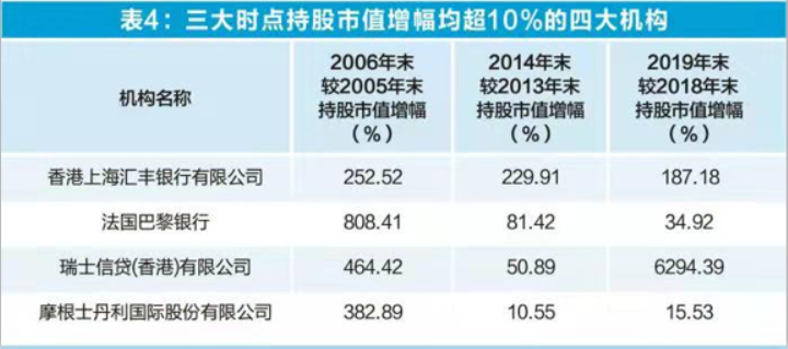 据证券时报·中国资本市场研究院统计,香港上海汇丰银行有限公司、法国巴黎银行、瑞士信贷(香港)有限公司、摩根士丹利国际股份有限公司等四家机构,在上证指数2004年以来的三个阶段性高点的前一年末持股市值较上年末均增长超10%,其中香港上海汇丰银行有限公司在三个时点末的增仓幅度均超QFII整体增仓幅度,对大行情的把握最为精准,2006年末持股市值较2005年末增长2.53倍,2014年末持股市值较2013年末增长2.3倍,2019年末持股市值较2018年末增长1.87倍。