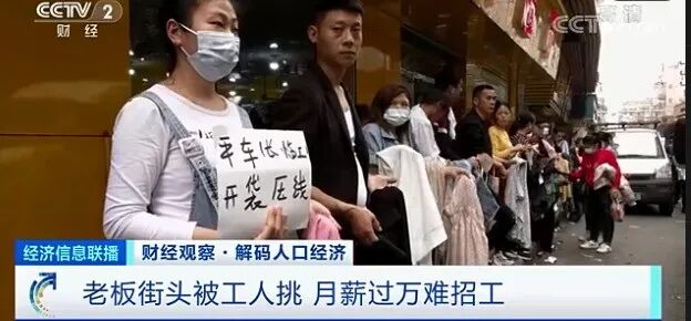 不仅在广东,四川成都的“淘宝村”也出现了招工难的情况,工厂老板举牌等着被工人“挑”,很多招聘广告上标注的工资,平均月薪都在五千到八千元左右,大部分还包吃住,可即便如此,很多工厂还是无人应聘。