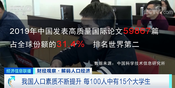 数据显示,我国具有大学文化程度的人口超过2.18亿人,与10年前相比增加1亿人。每10万人中具有大学文化程度的由8930人上升为15467人。2019年,中国发表高质量国际论文59867篇,占全球份额的31.4%,排名世界第二。