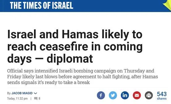 环球网刚刚报道,据《以色列时报》最新消息,一位外交知情人士当地时间14日透露,以色列和巴勒斯坦伊斯兰抵抗运动(哈马斯)可能在未来几天内达成停火协议。