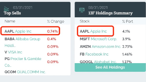前五大减持股中,苹果位列第一,但仍为其第一大重仓股。从减持幅度来看,先锋领航减持苹果的比例很大,但由于持仓市值过高而成为第一大减持股中。
