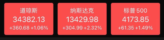 5月14日,美股依然延续周四的反弹走势。截至收盘,道琼斯指数涨1.06%,报34382.13点。标普500指数涨1.49%,报4173.85点。纳斯达克指数涨2.32%,报13429.98点。