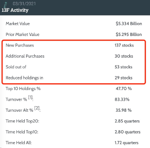 今年一季度末,索罗斯基金持仓规模为53.34亿美元。今年一季度,该基金新进137支股票,加仓30只股票,清仓53只股票,减仓29支股票。