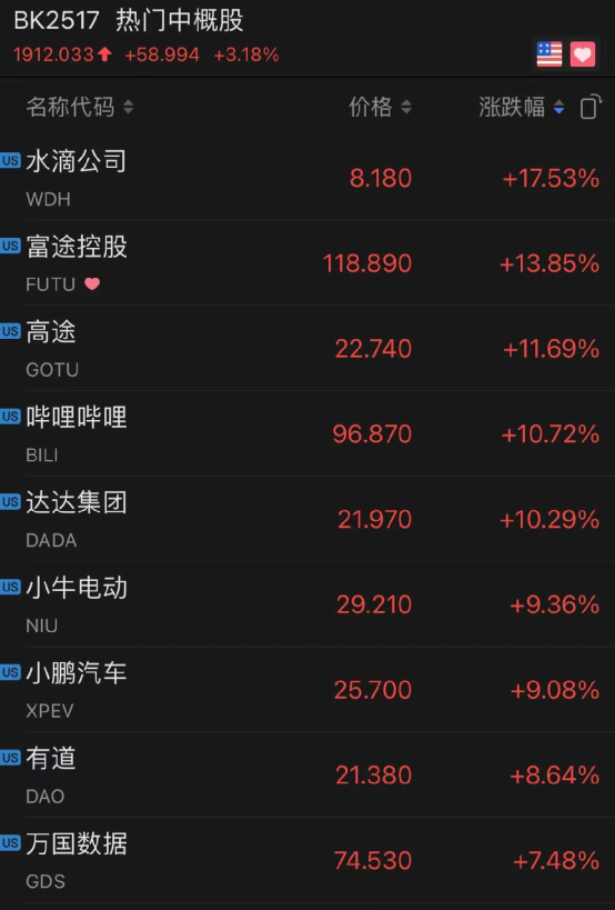 周五,大盘继续上涨之际,美股科技龙头和明星中概股整体也呈现出强劲反弹的走势。