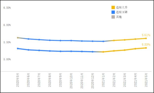 2021年5月(数据采集期为2021年4月20日-2021年5月18日),全国首套房贷款平均利率为5.33%,环比上涨2BP;二套房贷款平均利率为5.61%,环比上涨2BP。其中,21城市的房贷利率平均水平环比上涨。