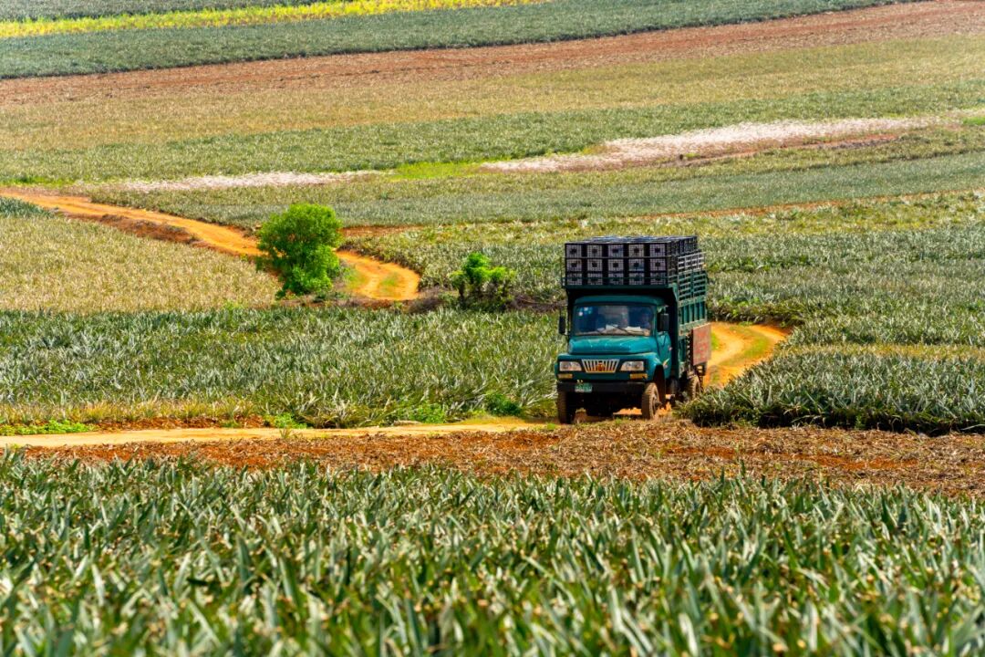 △2021年3月,广东省湛江市徐闻县曲界镇,工作人员采摘菠萝。(中新社/陈骥旻 图片来源/视觉中国)砖红土壤、光照充足、雨量充沛