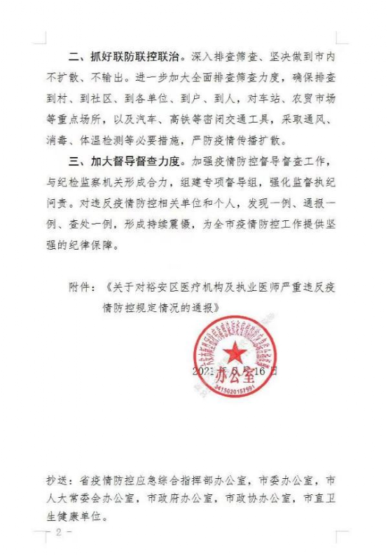 据央视,六安市已要求各县区疫情防控应急综合指挥部、市指挥部各成员单位,进一步加大全面排查筛查力度,确保排查到村、到社区、到各单位、到户、到人,对车站、农贸市场等重点场所,以及汽车、高铁等密闭交通工具,采取通风、消毒、体温检测等必要措施,严防疫情传播扩散,从而“深入排查筛查、坚决做到市内不扩散、不输出”。