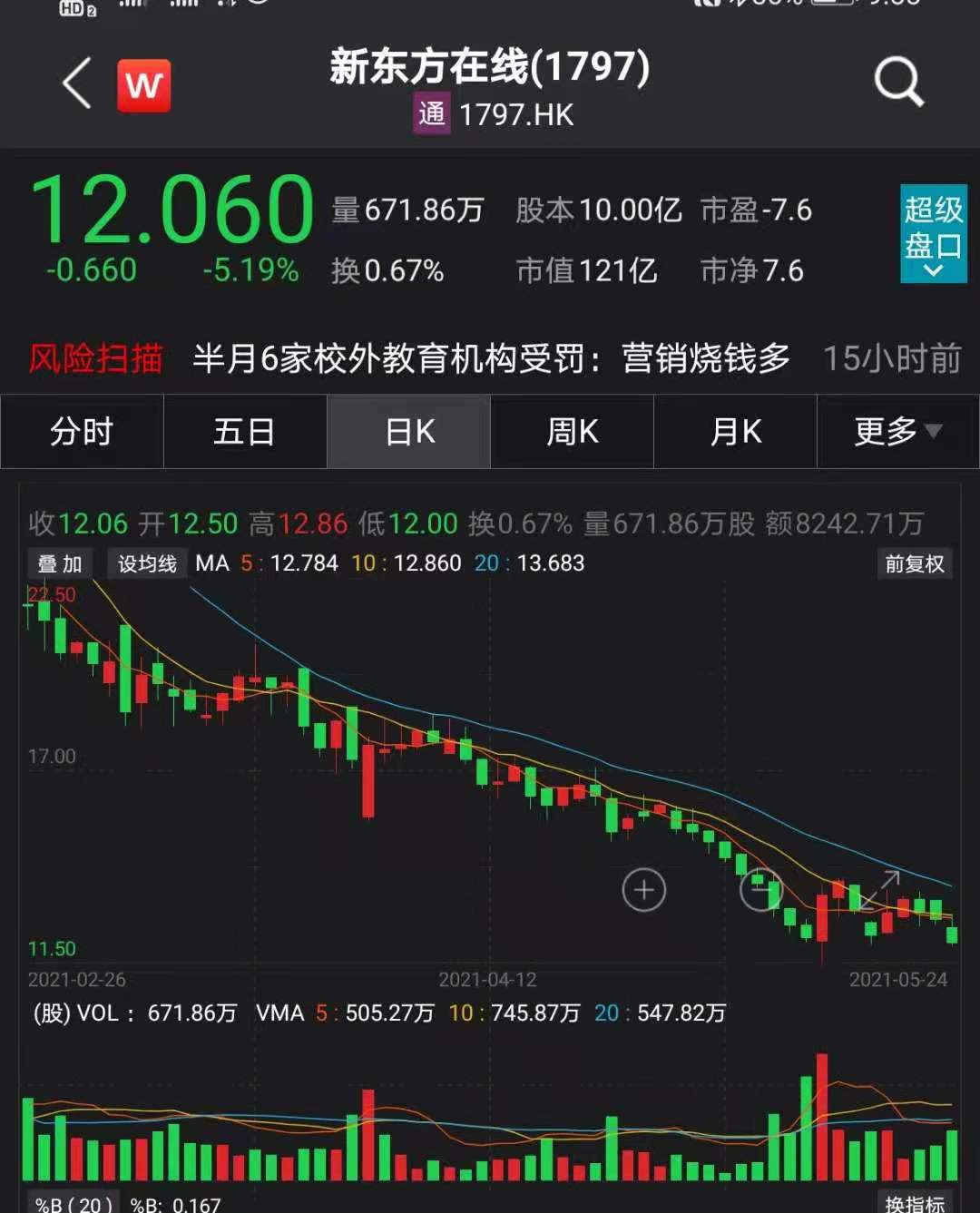 24日港股市场上,港股新东方下跌5.19%。