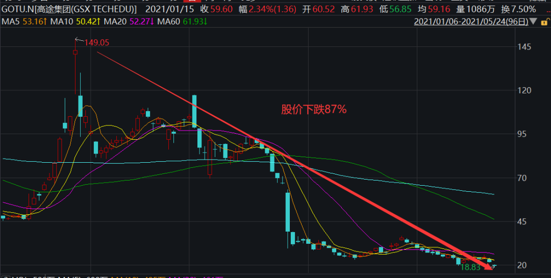 命运的转折点,发生在2月底。教育部表示要规范校外培训机构。行业的整顿之风愈演愈烈,变更了名字的跟谁学(高途)截至目前,已经从1月的高位下跌了87%。